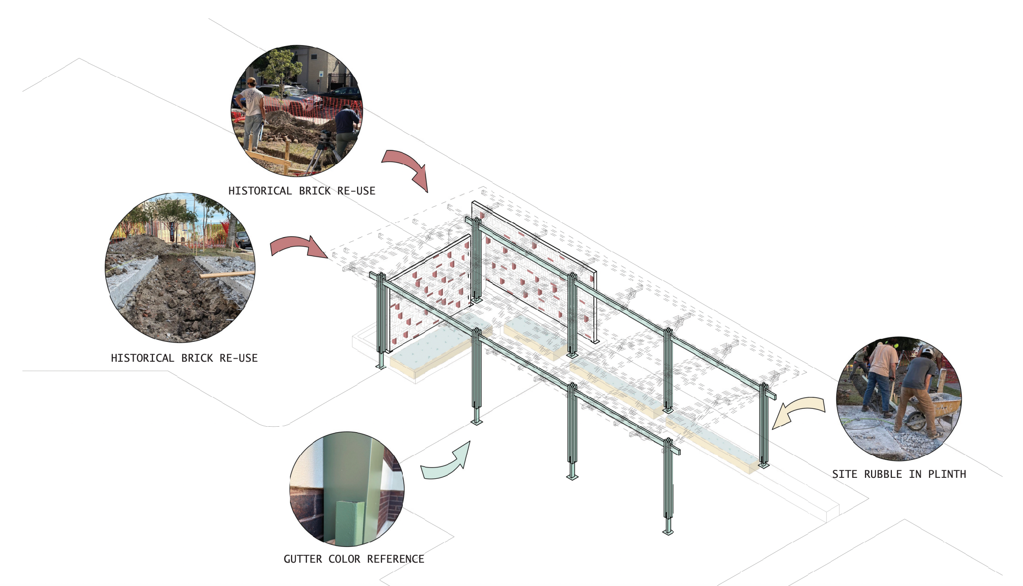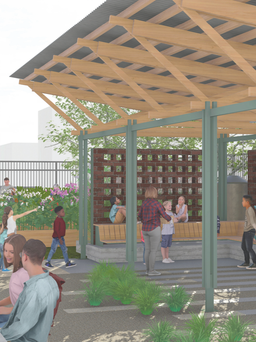 The drawings and images shown are from my group’s scheme with a shed roof, rain garden, and brick walls to define space.